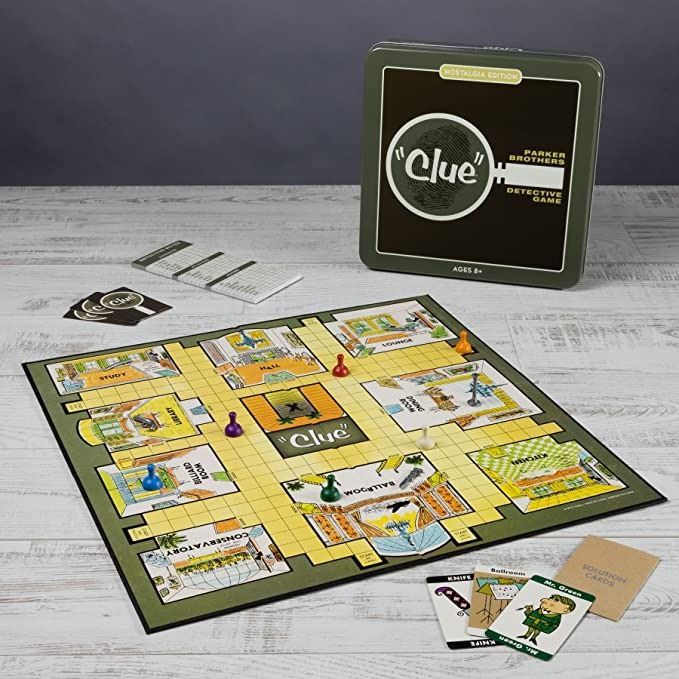 The Clue Nostalgia Tin Game from Hasbro provides not only a fun and engaging activity for groups but also a classic collectible. Players must navigate the mansion and its rooms guessing who killed Mr. Boddy, in which room and with what weapon. Eliminate the possibilities until you are sure you know the solution. If you are correct, you win. The graphics on the board and cards are based on the original edition of the game from the 1960s for a classic retro look. A special edition tin for storing the pieces is also included. This vintage board game is recommended for ages 8 and up.