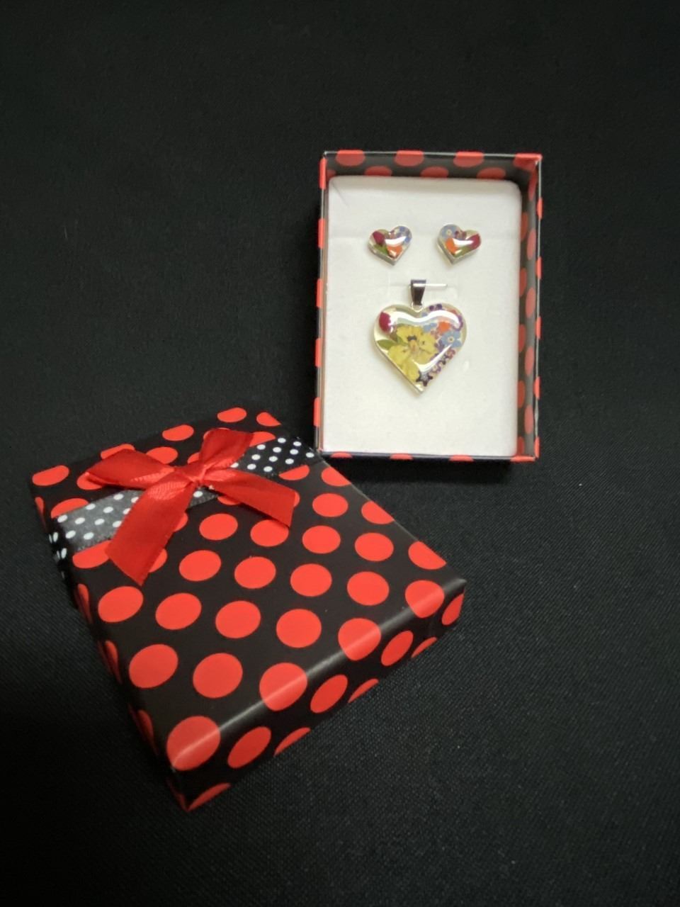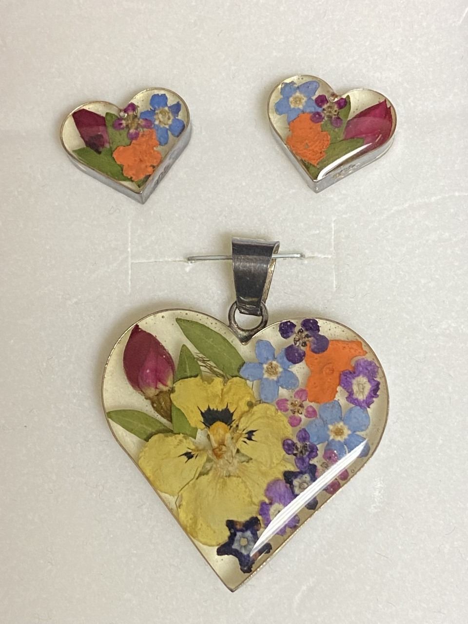This heart-shaped earring and pendant set is made of resin formed around a sweet selection of flowers and is sure to bring many compliments. Comes in a delightful gift box as shown.
