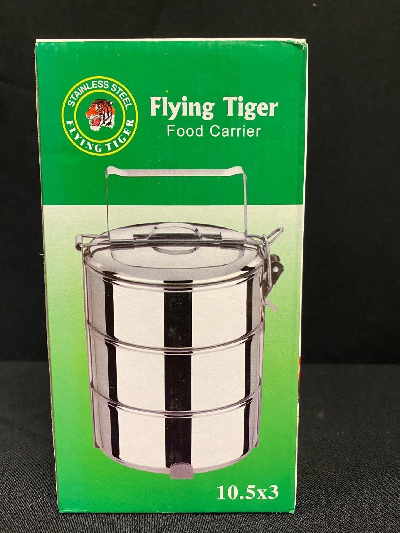 Carry your food in style with this 3 compartment Flying Tiger stainless steel food carrier.