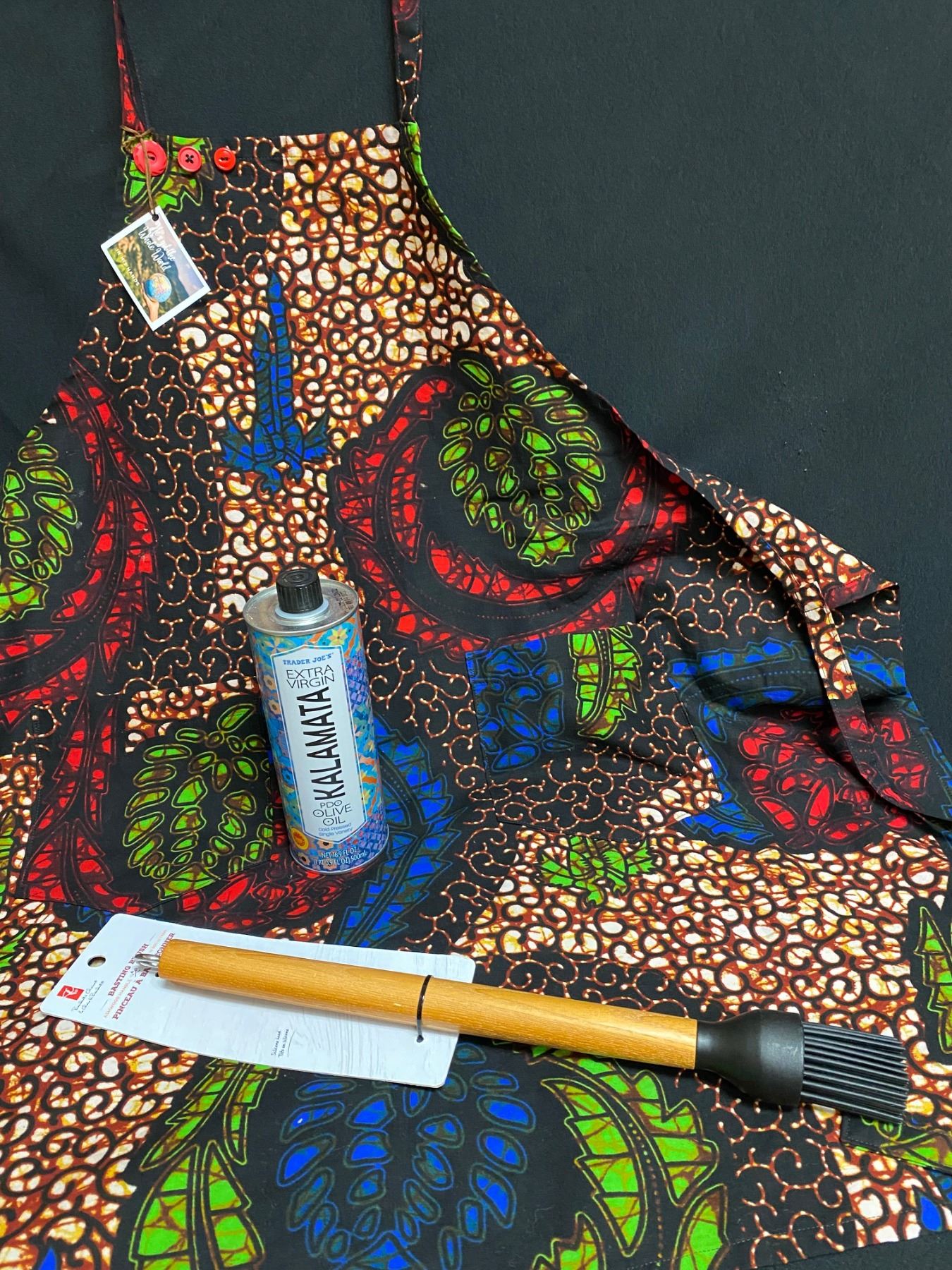 Create your favourite dishes in style wearing this gorgeous, bibbed apron lovingly sewn from chitenga material from Zambia.