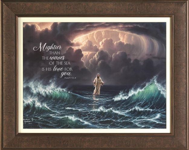 This dramatic image of Jesus walking on the water in a storm is beautifully interpreted by artist Abraham Hunter. Also includes the scripture verse Psalm 93:4: Mightier than the waves of the sea is His love for you. Picture is framed under glass; frame is antique mottled brown finish. Print and glass size is 26 x 20; outer frame size is 31 5/8 x 25 3/4. Sturdy wire hanger on back.