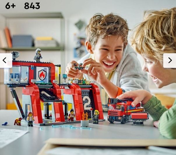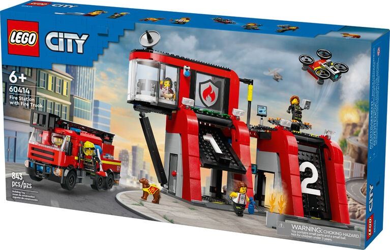 Spark kids' imaginations with the LEGO City Fire Station with Fire Truck (60414) toy playset for ages 6 and up. The fire station toy features a modern control center, kitchenette and sleeping quarters above an equipment area and 2 garages with tall up-and-over doors. The pretend play toy building set also includes a toy drone and a cool fire engine with a modular ladder and extinguisher attachments. Mobilize the 5 fire crew minifigures and fire dog figure for hours of action packed firefighting role play. Kids can use this set with others from the LEGO City collection (sold separately) for even bigger adventures! This emergency rescue fire truck toy includes an easy to follow printed building guide and step-by-step 3D instructions in the LEGO Builder app. Here kids can zoom in and rotate to visualize models from all angles as they build. LEGO City Fire playsets deliver feature rich land, air and water toys for imaginative play without limits. Contains 843 pieces.