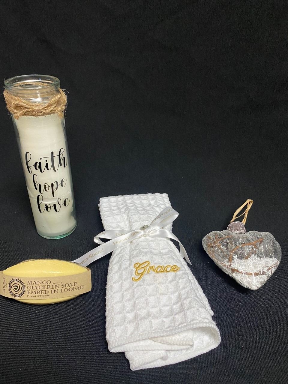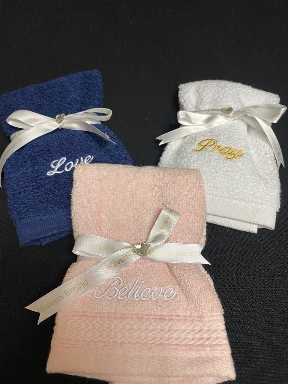 3 x face cloths embroidered with LOVE, BELIEVE, PRAY