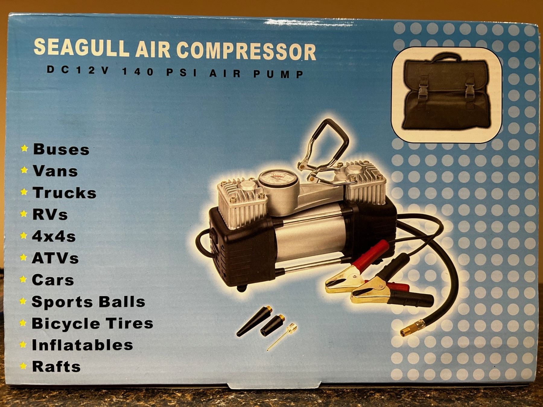 Great for tires, balls, rafts, inflatables, this 12V 140 PSI Air Pump is one tool you don't want to be without. Compact and light, it comes with its own twin compartment carry/storage bag.