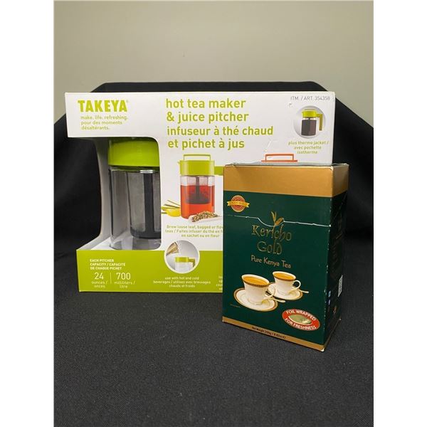 Takeya Hot Tea Maker and Juice Pitcher (Thermo Jacket included) Capacity of each pitcher: 24 ounces or 700 millilitres Hot Tea Maker includes removabl