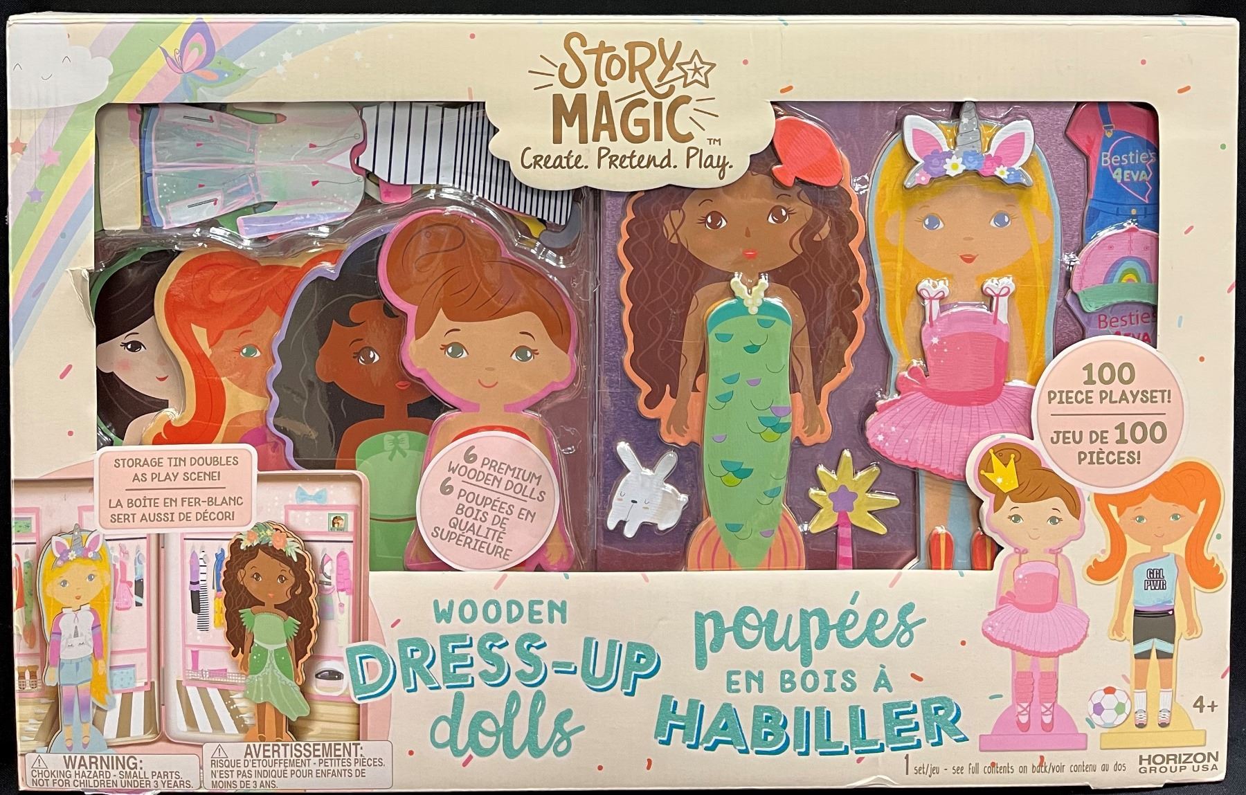 Create. Pretend. Play! Immerse yourself in the magical world of Story Magic and prepare for some seriously magical dress-up fun with the 2-in-1 Dress Up Doll Playset! Mix & match 80+ magnetic outfits and accessories onto 6 premium wooden dolls, then create a whimsical world with magical play scenes inside a tin storage case.
