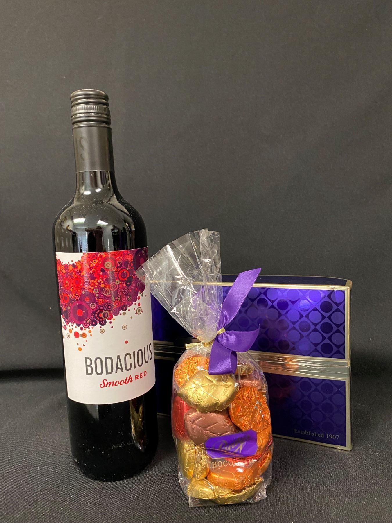 Enjoy a bottle of Bodacious Smooth Red Wine, Purdy's Chocolate Leaves and a 250g box of Purdy's Assorted Chocolates for a perfect evening.